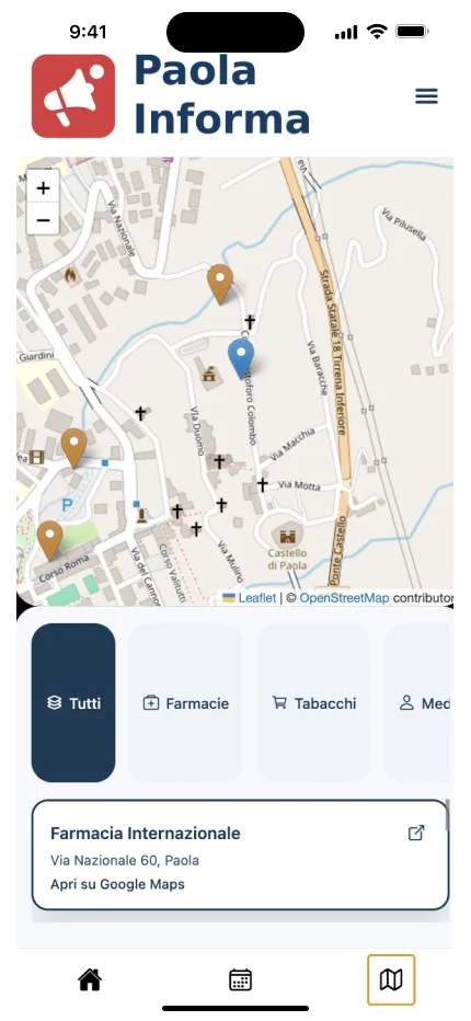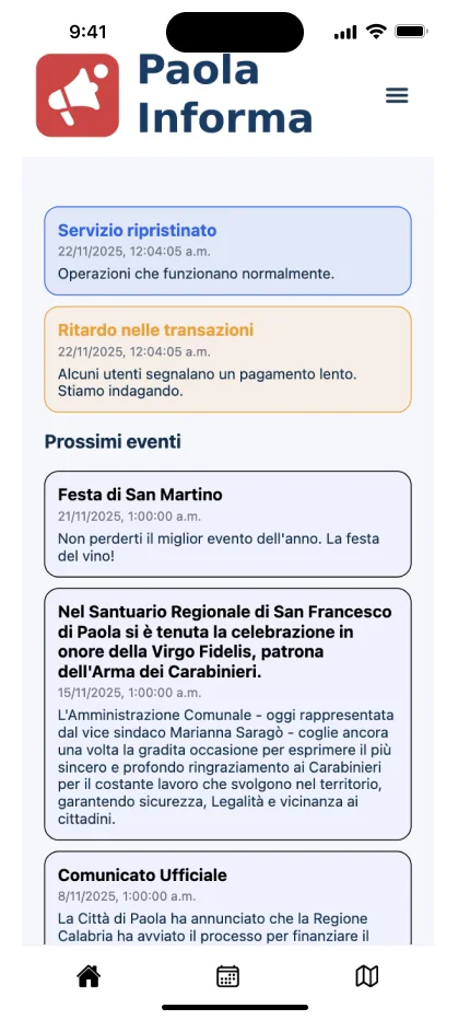 Aplicación móvil desarrollada para centralizar y distribuir información local relevante de la ciudad de Paola (Italia), eliminando la dependencia de redes sociales, grupos privados o canales informales. Paola Informa ofrece notificaciones claras, directas y segmentadas, pensadas para la vida diaria de los ciudadanos.